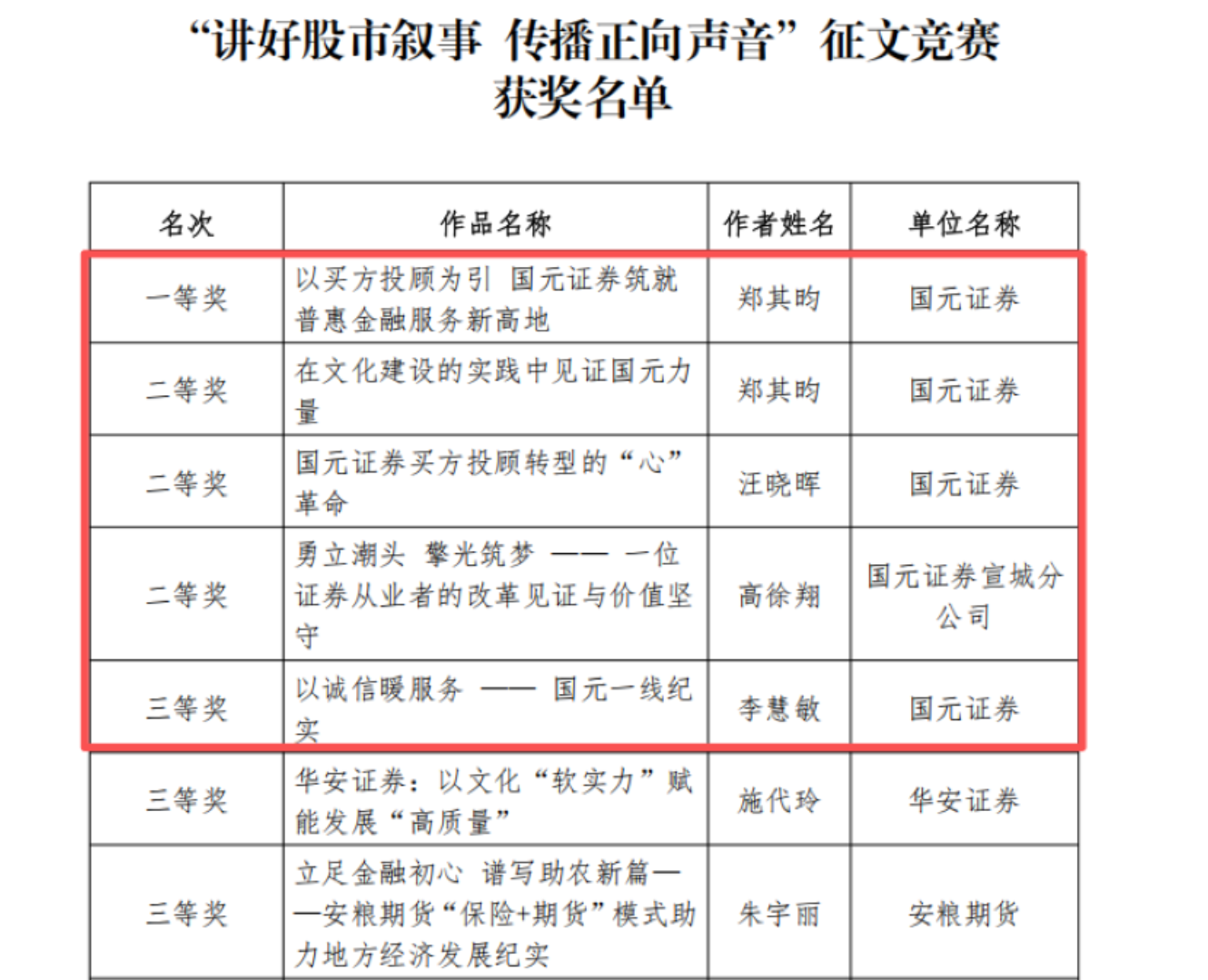 总裁办公室郑其昀作品《以买方投顾为引 国元证券筑就普惠金融服务新高地》《在文化建设的实践中见证国元力量》摘得一等奖与二等奖,普惠金融部汪晓晖作品《国元证券买方投顾转型的“心”革命》、国元证券宣城分公司高徐翔作品《勇立潮头 擎光筑梦——一位证券从业者的改革见证与价值坚守》荣获二等奖,总裁办公室李慧敏作品《以诚信暖服务——国元一线纪实》荣获三等奖,展示了公司在普惠金融、业务转型、文化建设等多领域的实践成果。
